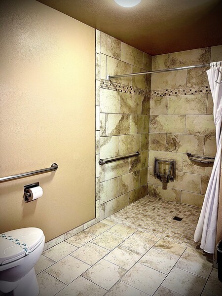One-bedroom suites, with queen sized beds, an accessible restroom with roll-in shower, complete kitchen, fully stocked with cookware and dishes, an open sitting area, and door-level parking. Rollaway beds available for an additional $25. These are the only units in the Columbia River Inn that can be accessed without climbing stairs. Call 1-800-633-6421 with any special requests or needs. Must show card to get AAA or AARP discount.